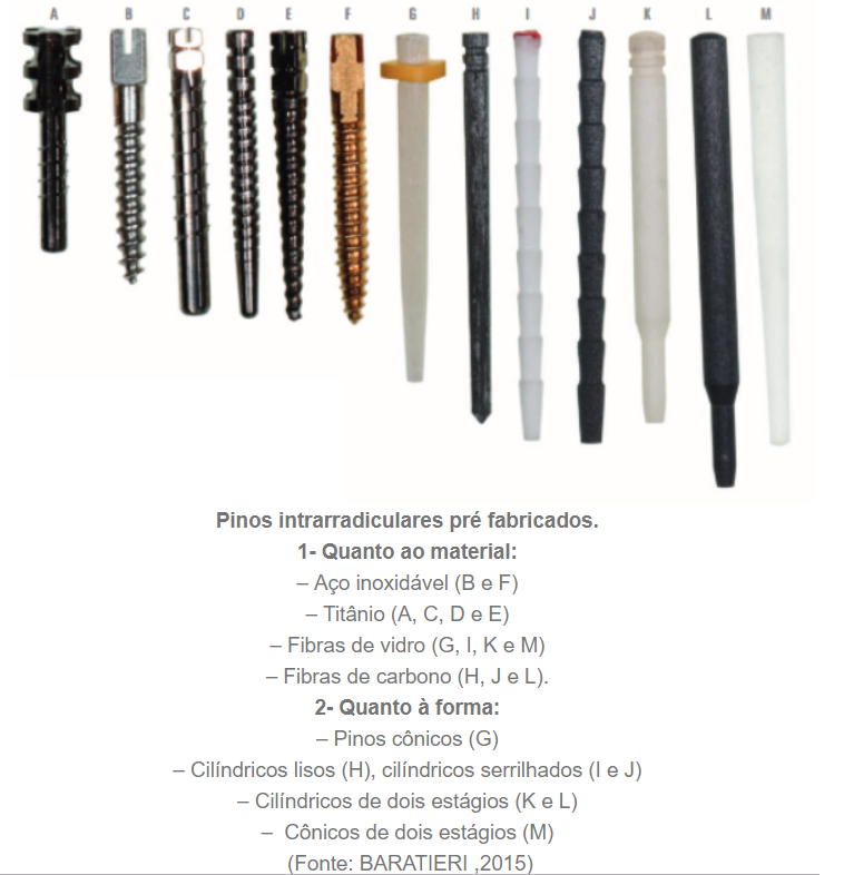 O pino que vai dentro da raiz (intraradicular) é usado quando o dente do paciente já esta com uma destruição tão grande que, por motivos mecânicos e físicos, nenhuma restauração aguentaria a força da mastigação. Sendo assim, quando possível e respeitando regras de medidas milimétricas, algumas opções podem ser utilizadas. Cada material com uma particularidade diferente; uns mais estéticos outros menos, uns mais caros outros mais baratos… etc..